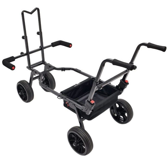 A game changing flat pack barrow from Daiwa that goes up in seconds! Incredibly quick and easy to assemble. These are ideal for saving valuable space in your car. With a super stable four wheel design that carries an impressive amount of gear on a solid steel frame. You can adjust the height on the arms on both the handles and cradle to allow a better fit for different sized boxes.